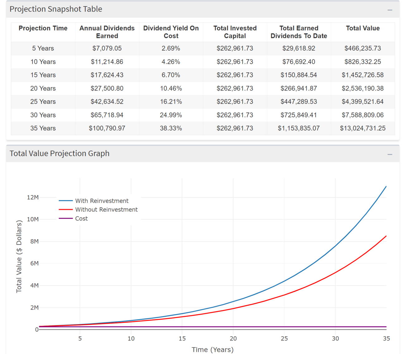 I used my Dividend Snowball Effect Calculator to project how my portfolio could grow over time, even without adding new money. By reinvesting dividends and assuming an average annual growth rate of 10% for stock price and 8% for dividend income, my portfolio is estimated to reach a total value of $13 million by the time I'm 60.