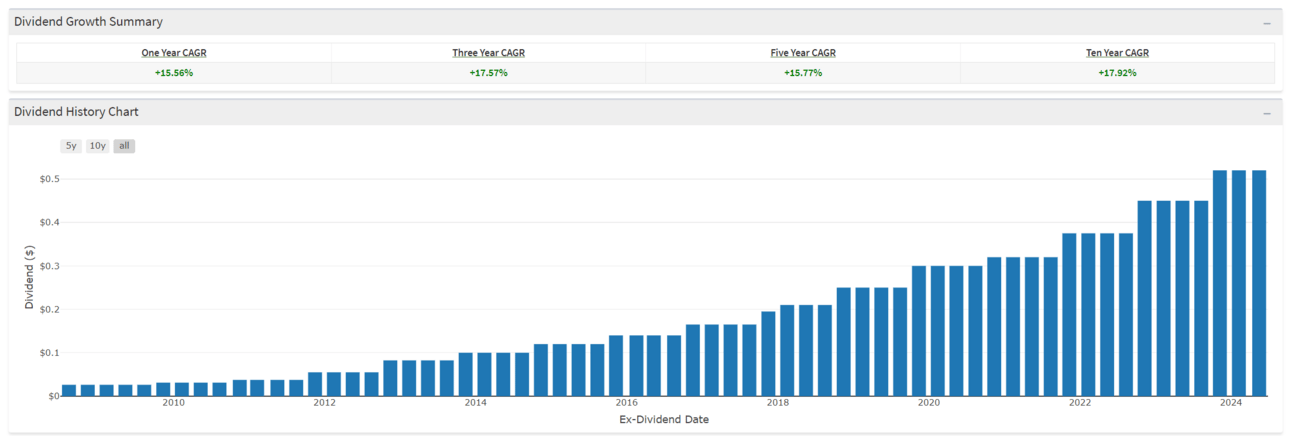 From a stock financial perspective, Visa is trading at ~$275 a share, ~550B market cap, a P/E of 30, and an annual dividend of $2.08 per share. The dividend has grown at a high rate every year since it’s 2008 IPO. Visa stock has a dividend compound annual growth rate (CAGR) of nearly 18% over the last 10 years. The most recent dividend increase was 15.56%.